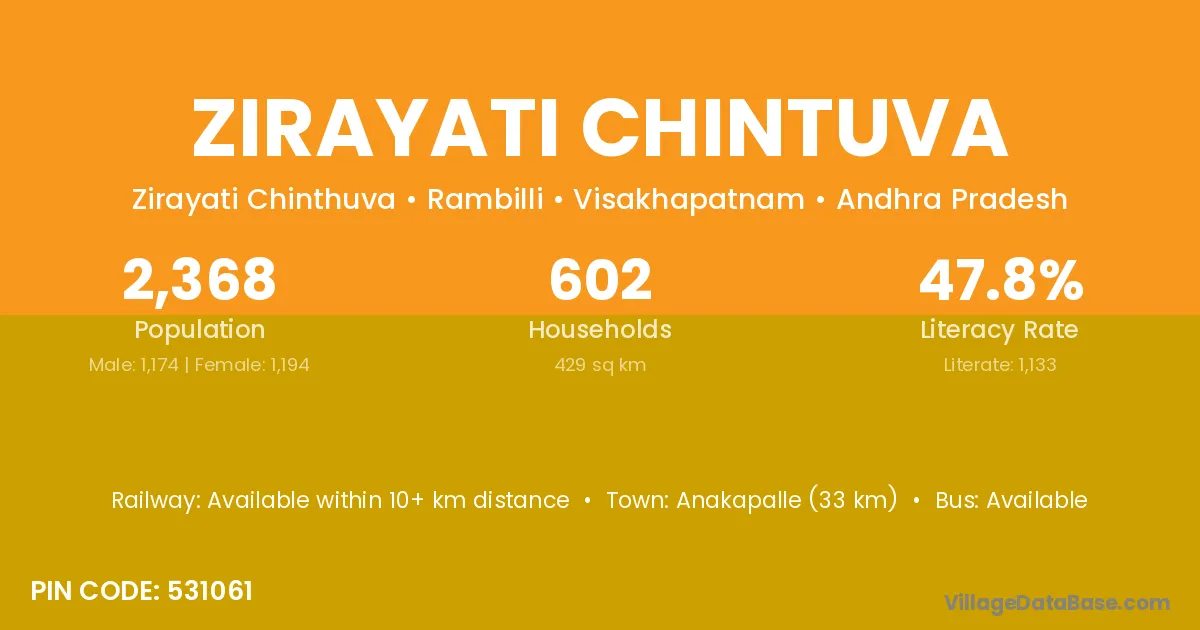 Anakapalle (33 km) is the nearest town to Zirayati Chintuva village for major economic activities and is located approximately 33 km away.