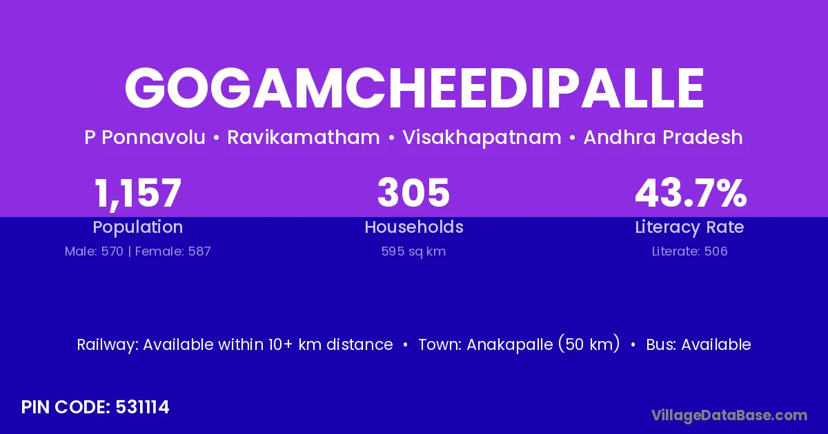 Gogamcheedipalle village has a total population of 1,157 people, of which 570 are males and 587 are females.