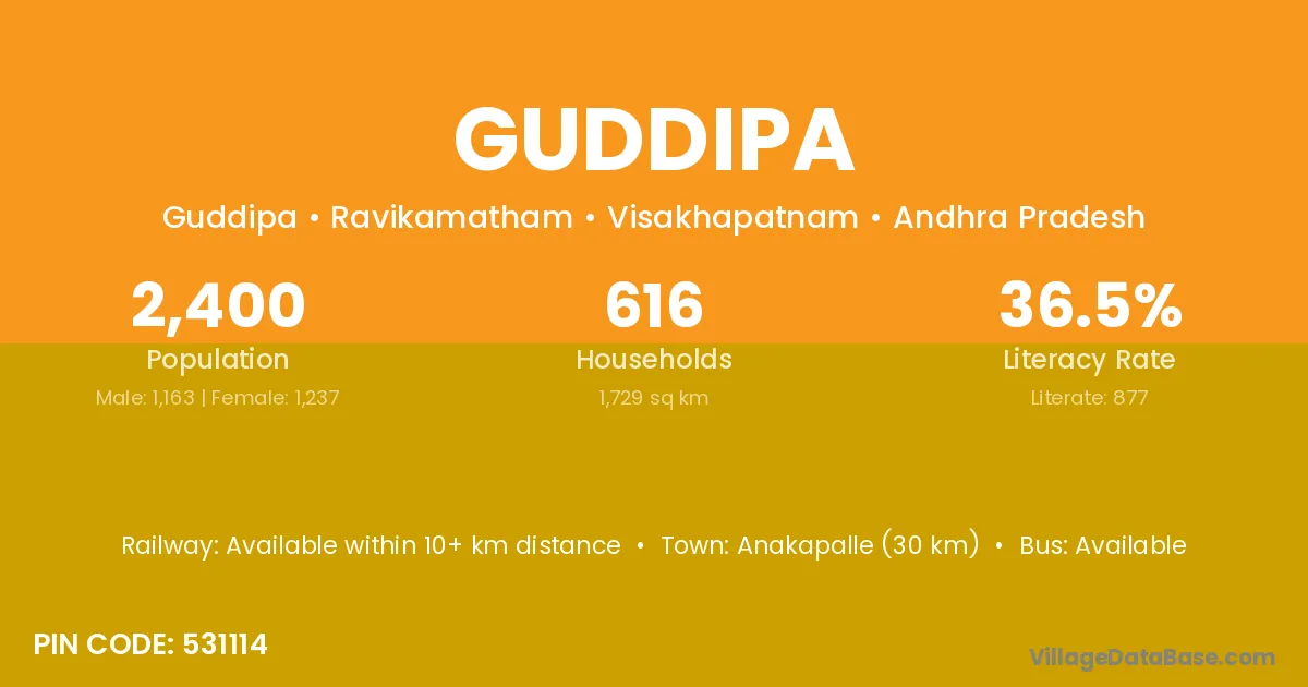 Anakapalle (30 km) is the nearest town to Guddipa village for major economic activities and is located approximately 30 km away.
