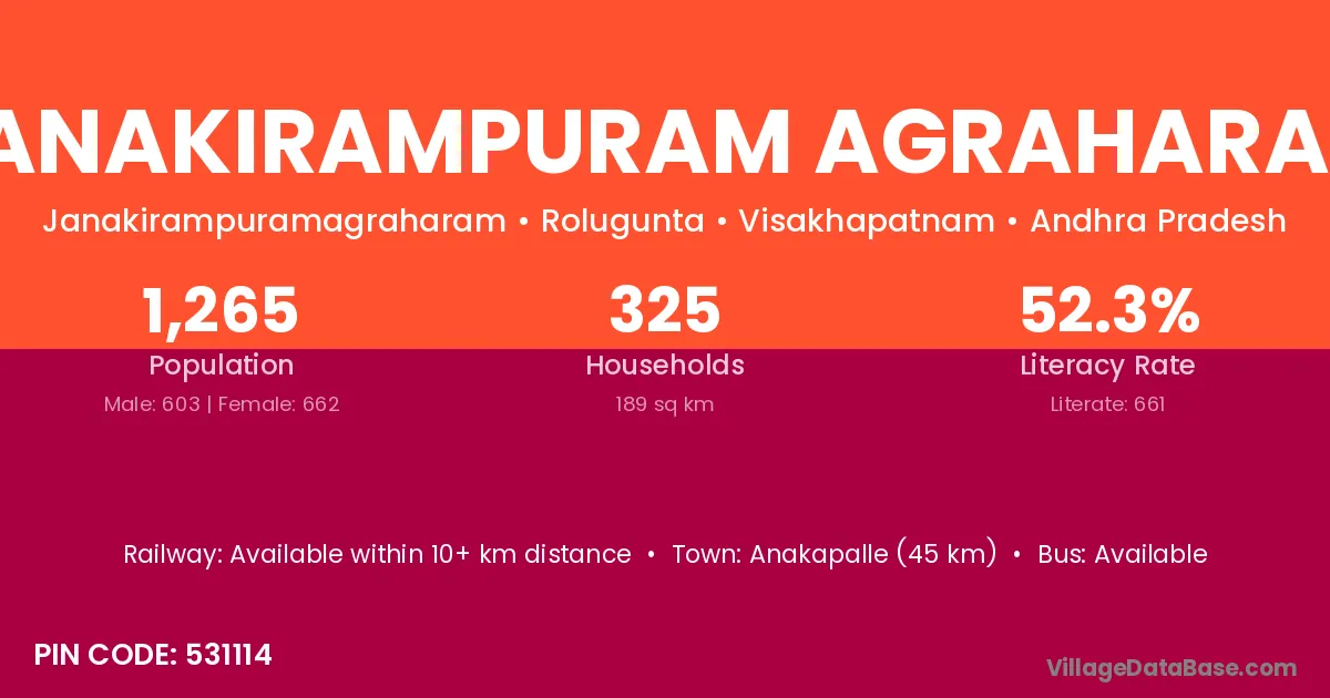 Anakapalle (45 km) is the nearest town to Janakirampuram Agraharam village for major economic activities and is located approximately 45 km away.