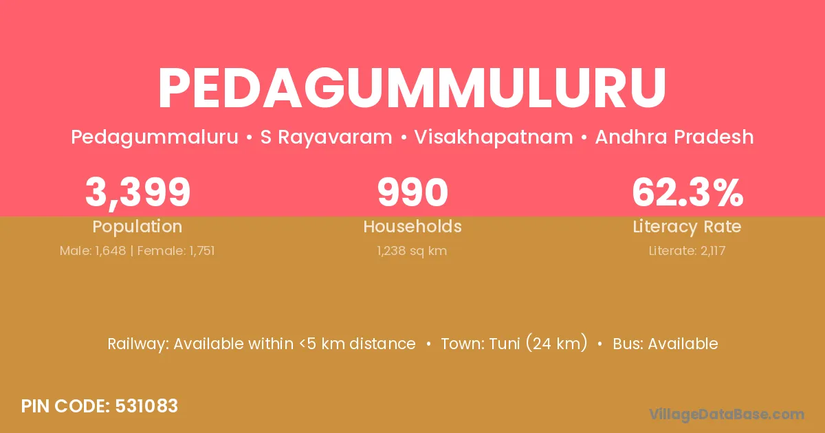 Tuni (24 km) is the nearest town to Pedagummuluru village for major economic activities and is located approximately 24 km away.