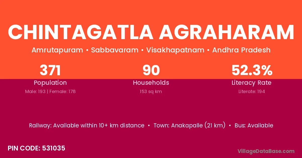 Chintagatla Agraharam village has a total population of 371 people, of which 193 are males and 178 are females.