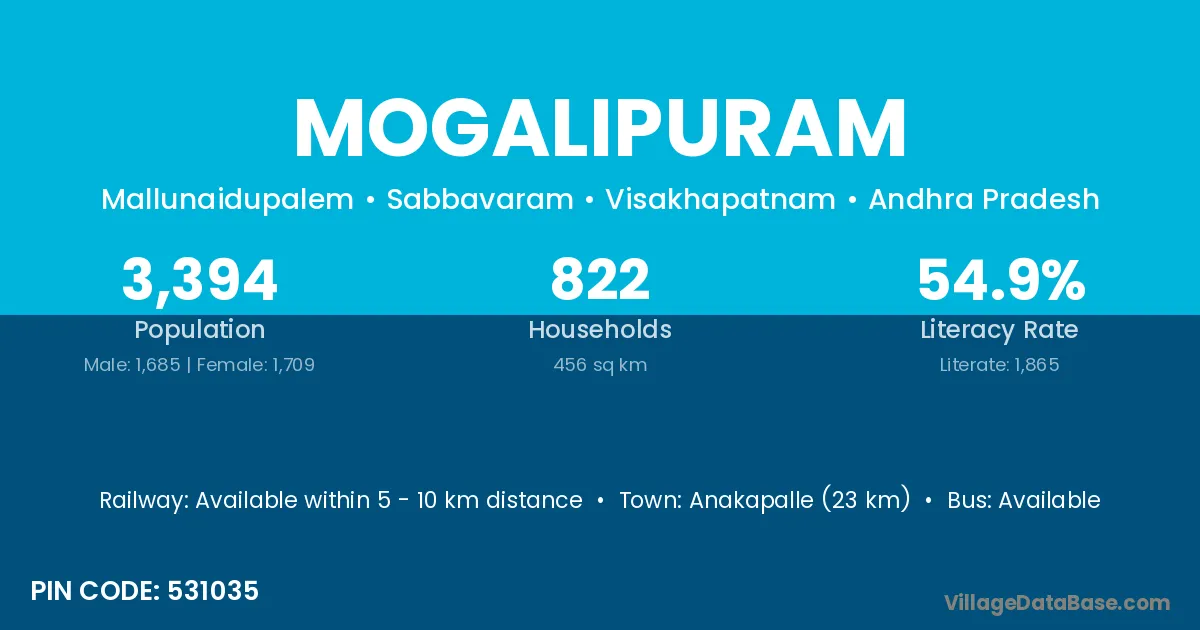 Anakapalle (23 km) is the nearest town to Mogalipuram village for major economic activities and is located approximately 23 km away.