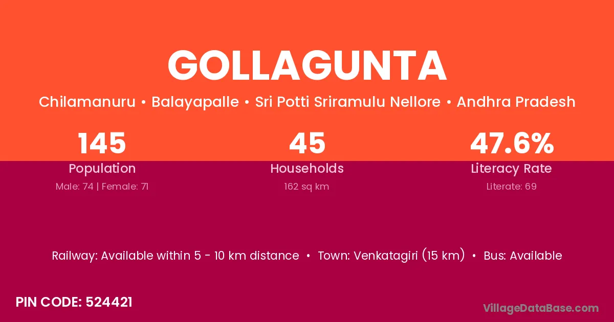 Anakapalle (30 km) is the nearest town to Gollagunta village for major economic activities and is located approximately 30 km away.