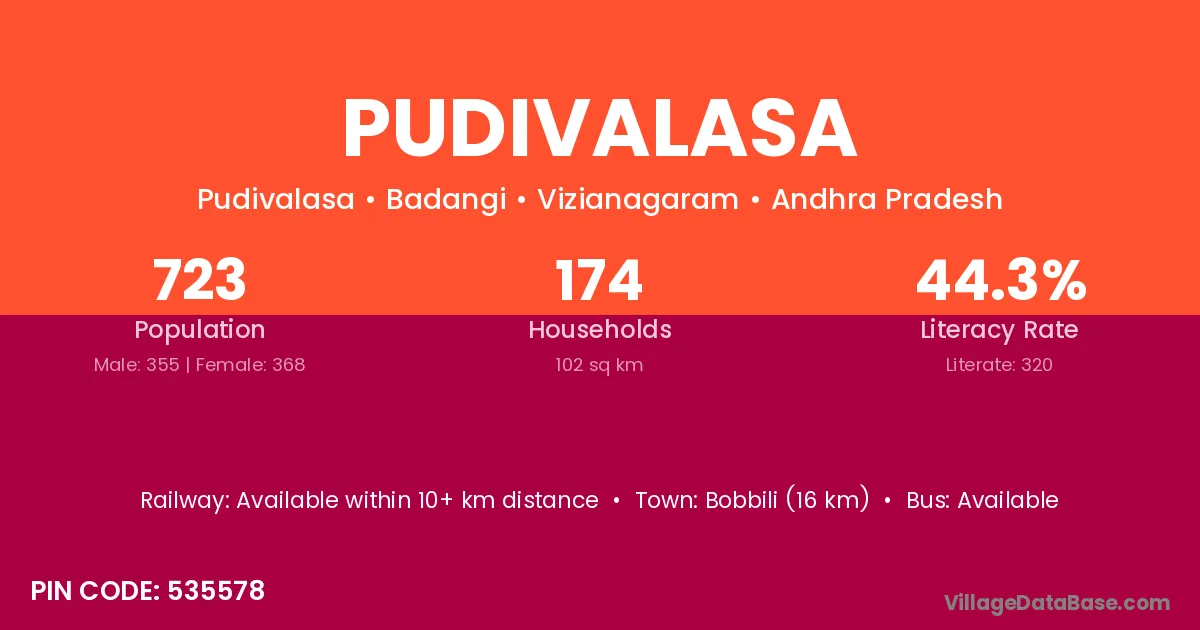 Bobbili (16 km) is the nearest town to Pudivalasa village for major economic activities and is located approximately 16 km away.