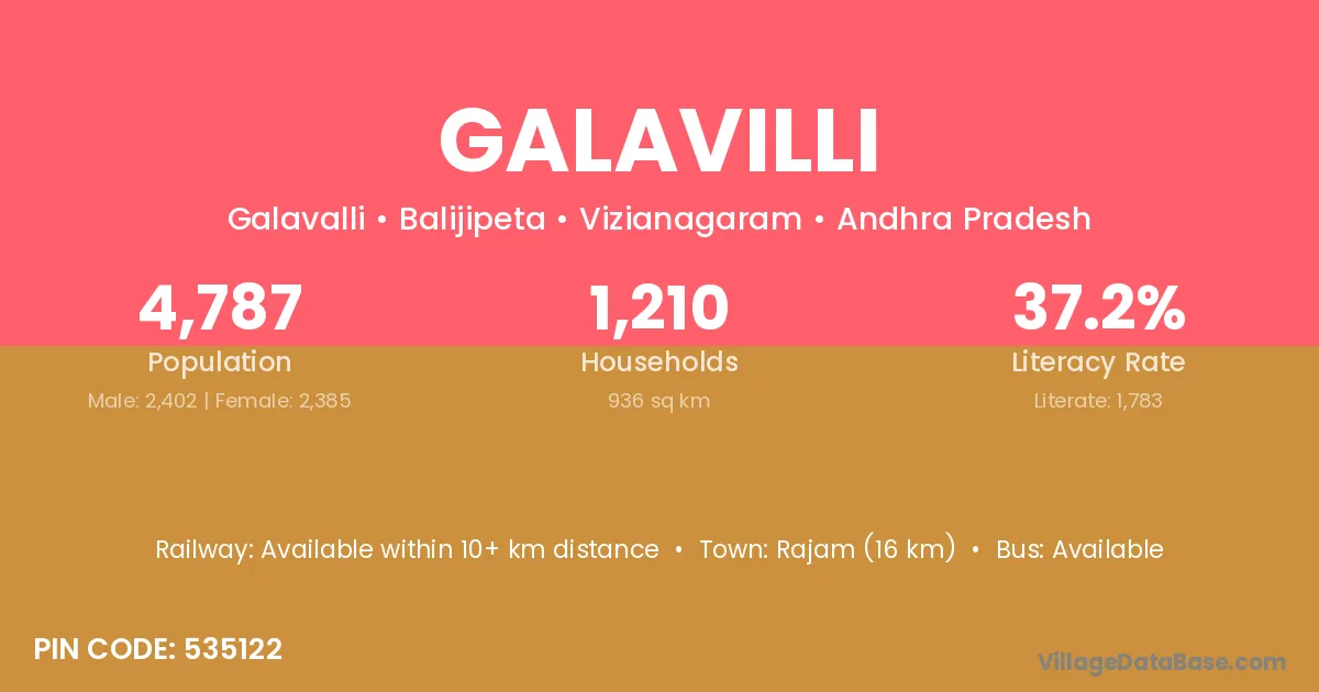 Rajam (16 km) is the nearest town to Galavilli village for major economic activities and is located approximately 16 km away.