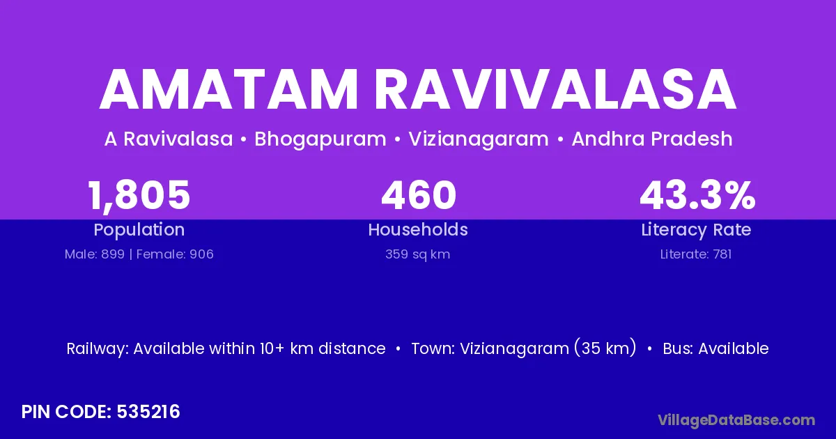 Vizianagaram (35 km) is the nearest town to Amatam Ravivalasa village for major economic activities and is located approximately 35 km away.