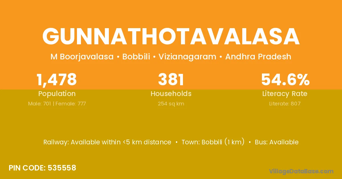 Bobbili (1 km) is the nearest town to Gunnathotavalasa village for major economic activities and is located approximately 1 km away.