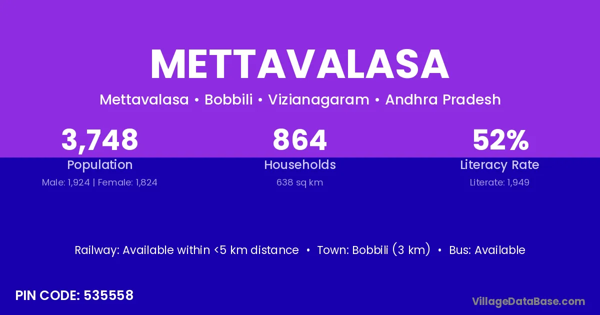 Bobbili (3 km) is the nearest town to Mettavalasa village for major economic activities and is located approximately 3 km away.