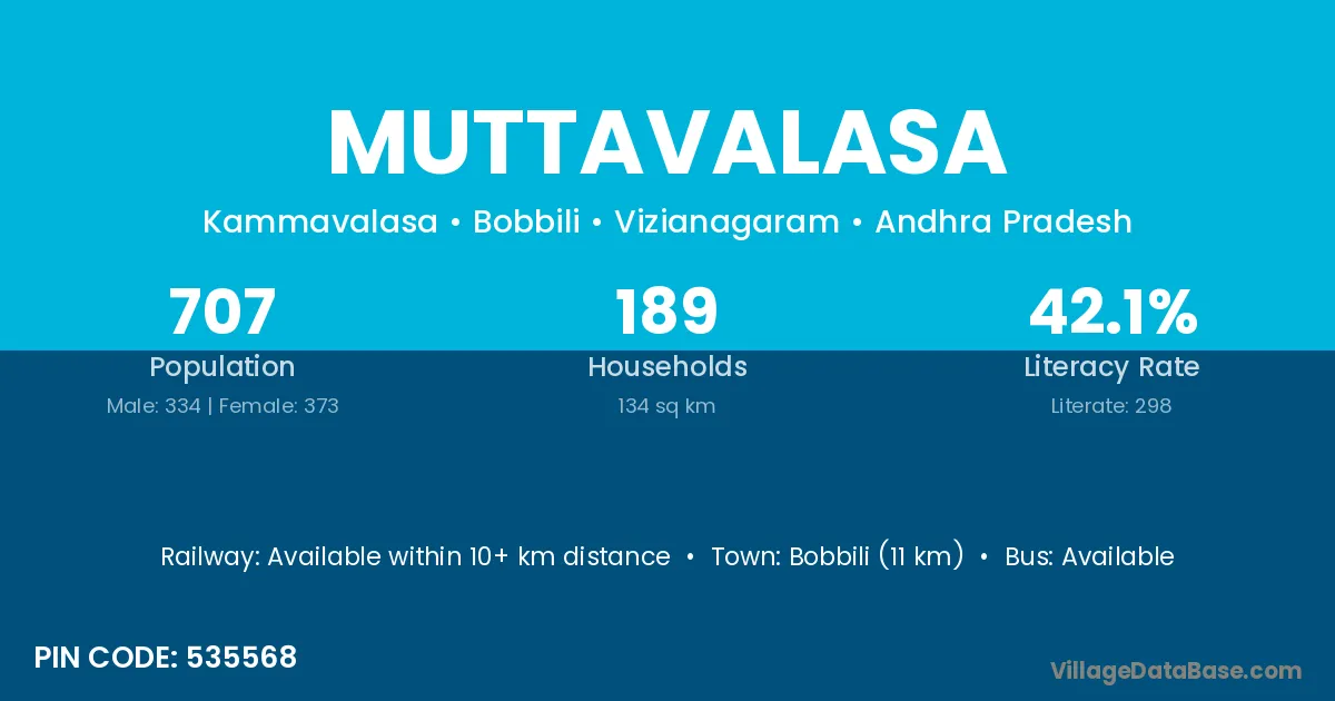 Bobbili (11 km) is the nearest town to Muttavalasa village for major economic activities and is located approximately 11 km away.