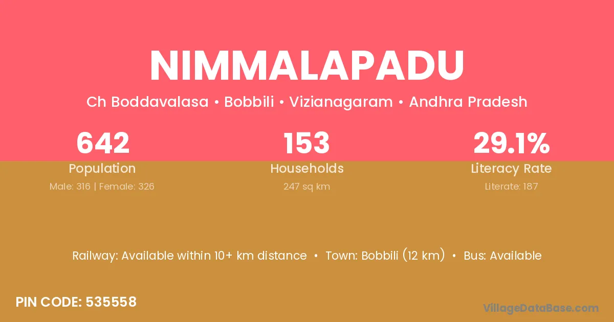 Bobbili (12 km) is the nearest town to Nimmalapadu village for major economic activities and is located approximately 12 km away.