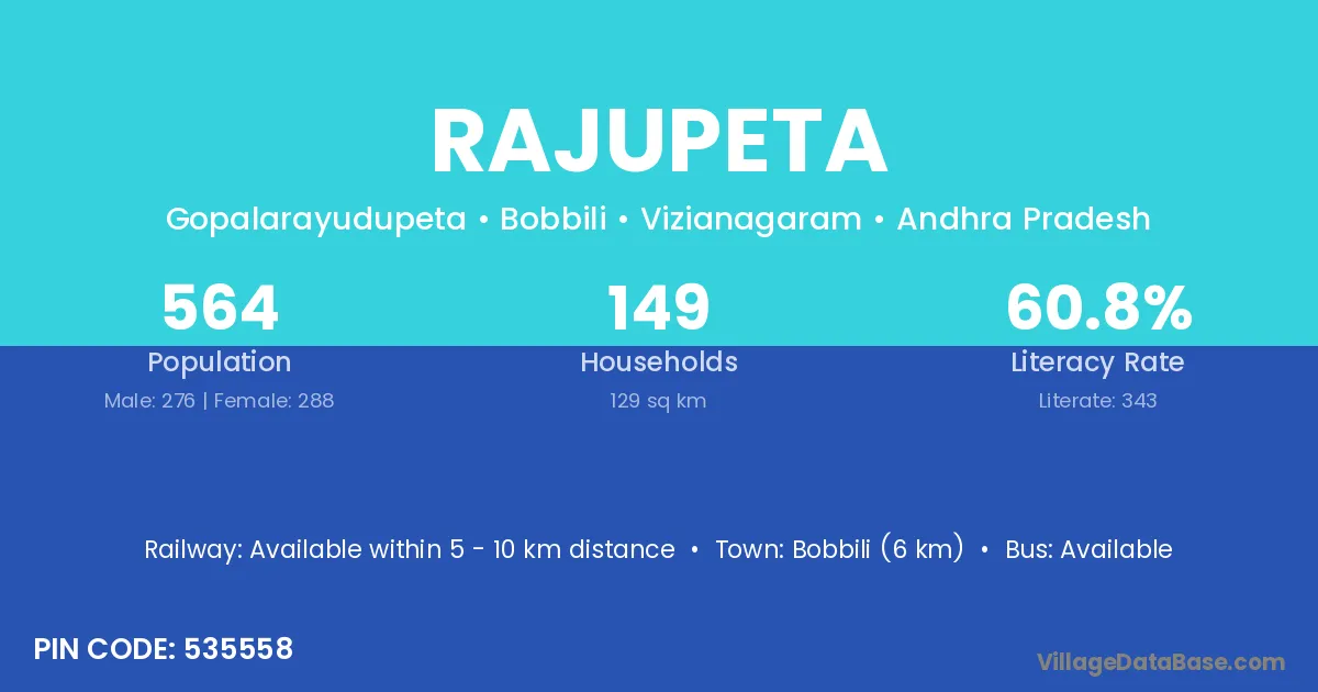 Bobbili (6 km) is the nearest town to Rajupeta village for major economic activities and is located approximately 6 km away.