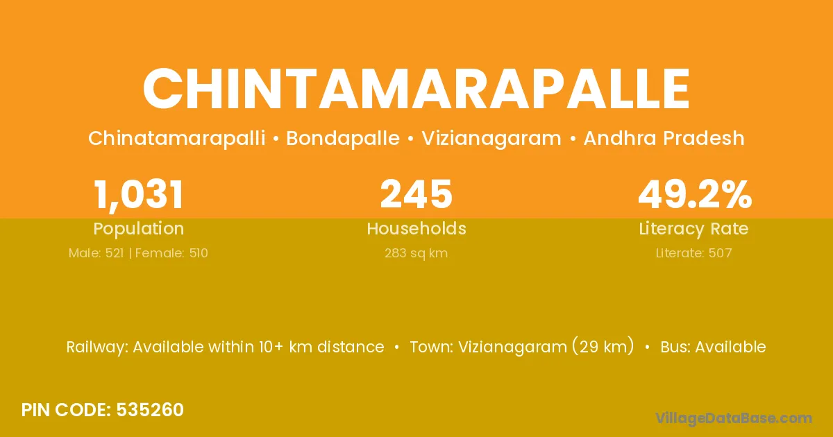 Chintamarapalle village has a total population of 1,031 people, of which 521 are males and 510 are females.