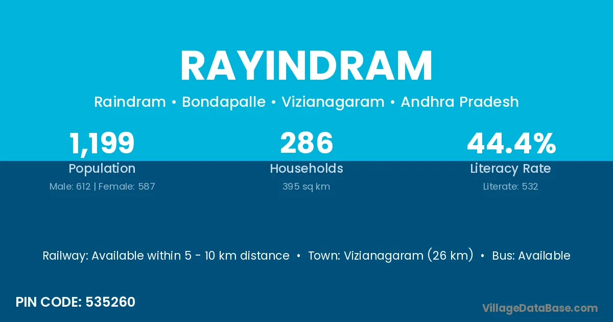 Vizianagaram (26 km) is the nearest town to Rayindram village for major economic activities and is located approximately 26 km away.