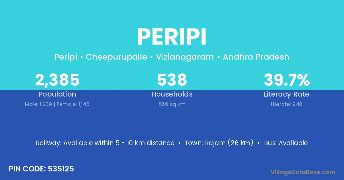Rajam (26 km) is the nearest town to Peripi village for major economic activities and is located approximately 26 km away.