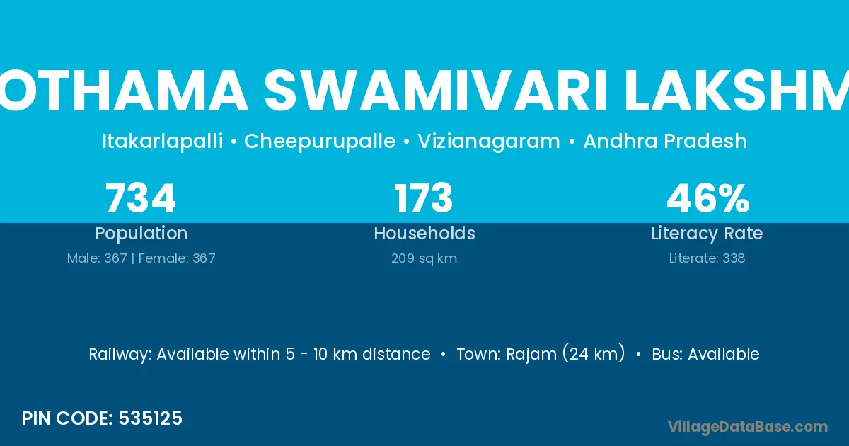 Rajam (24 km) is the nearest town to Purushothama Swamivari Lakshmipuram village for major economic activities and is located approximately 24 km away.