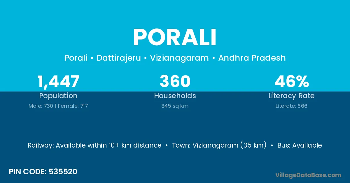 Vizianagaram (35 km) is the nearest town to Porali village for major economic activities and is located approximately 35 km away.