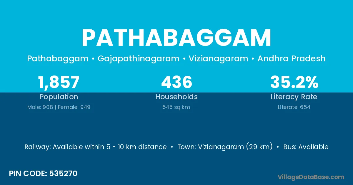 Pathabaggam village has a total population of 1,857 people, of which 908 are males and 949 are females.