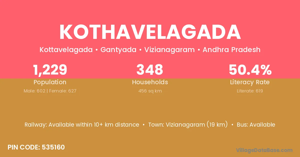 Kothavelagada village has a total population of 1,229 people, of which 602 are males and 627 are females.