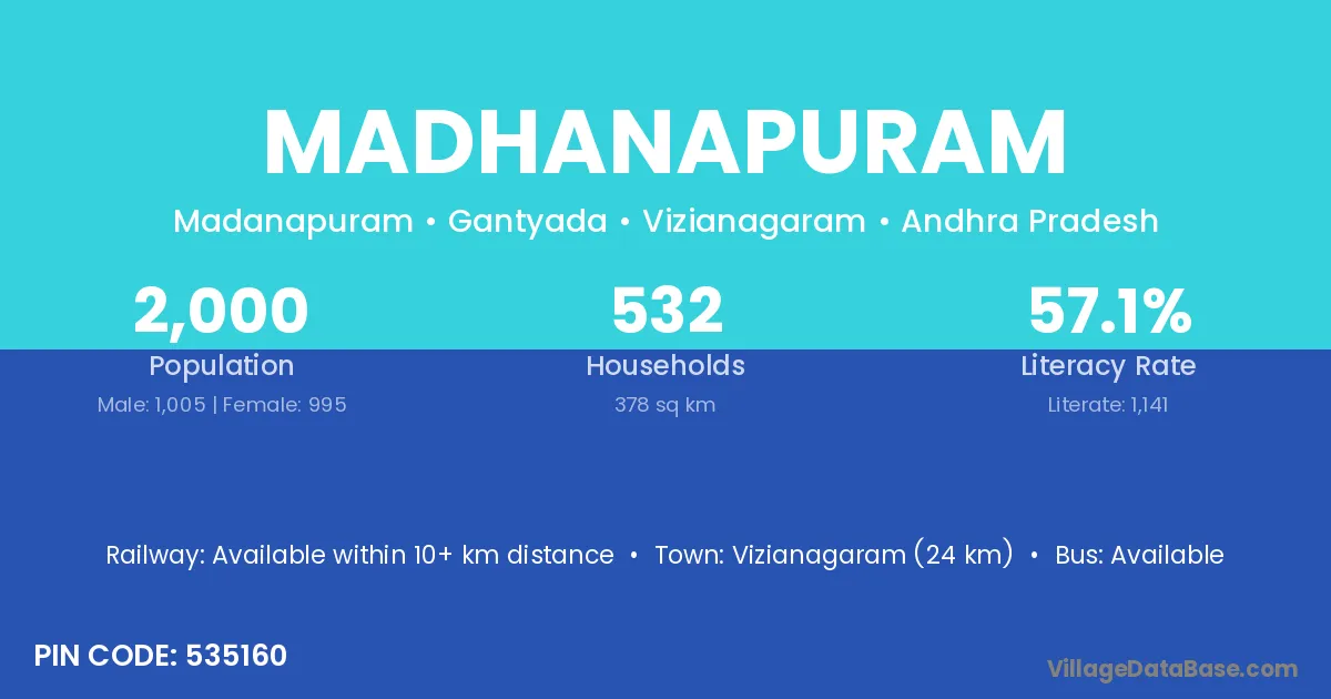 Vizianagaram (24 km) is the nearest town to Madhanapuram village for major economic activities and is located approximately 24 km away.