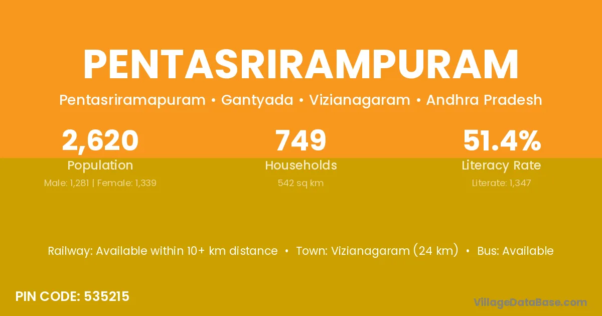 Vizianagaram (24 km) is the nearest town to Pentasrirampuram village for major economic activities and is located approximately 24 km away.