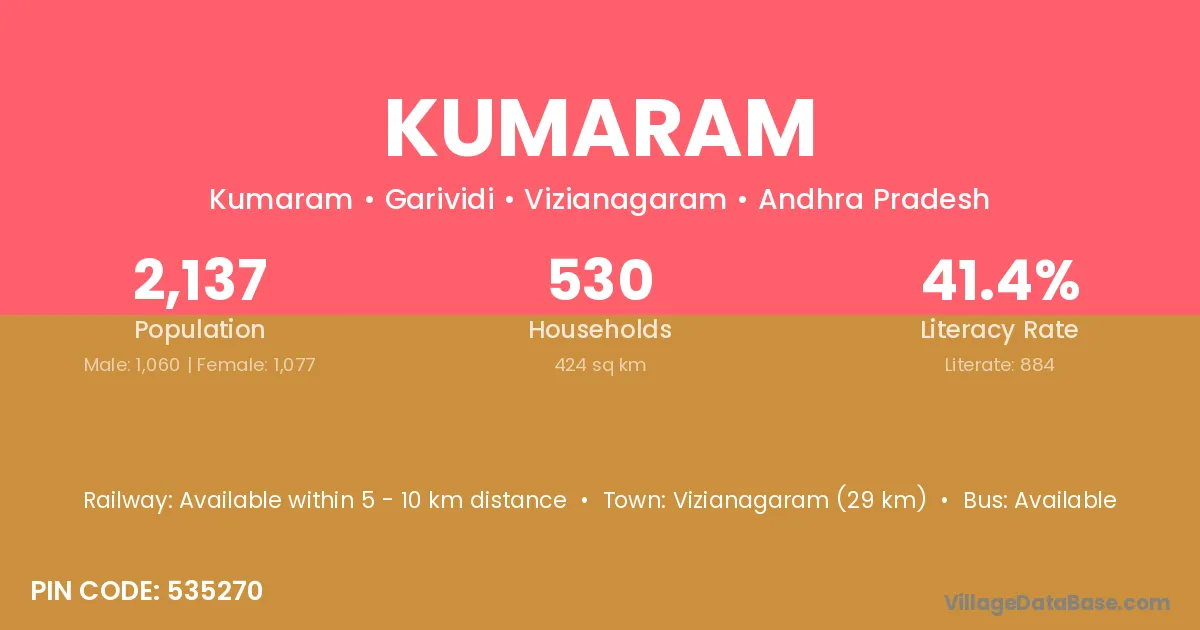 Vizianagaram (29 km) is the nearest town to Kumaram village for major economic activities and is located approximately 29 km away.
