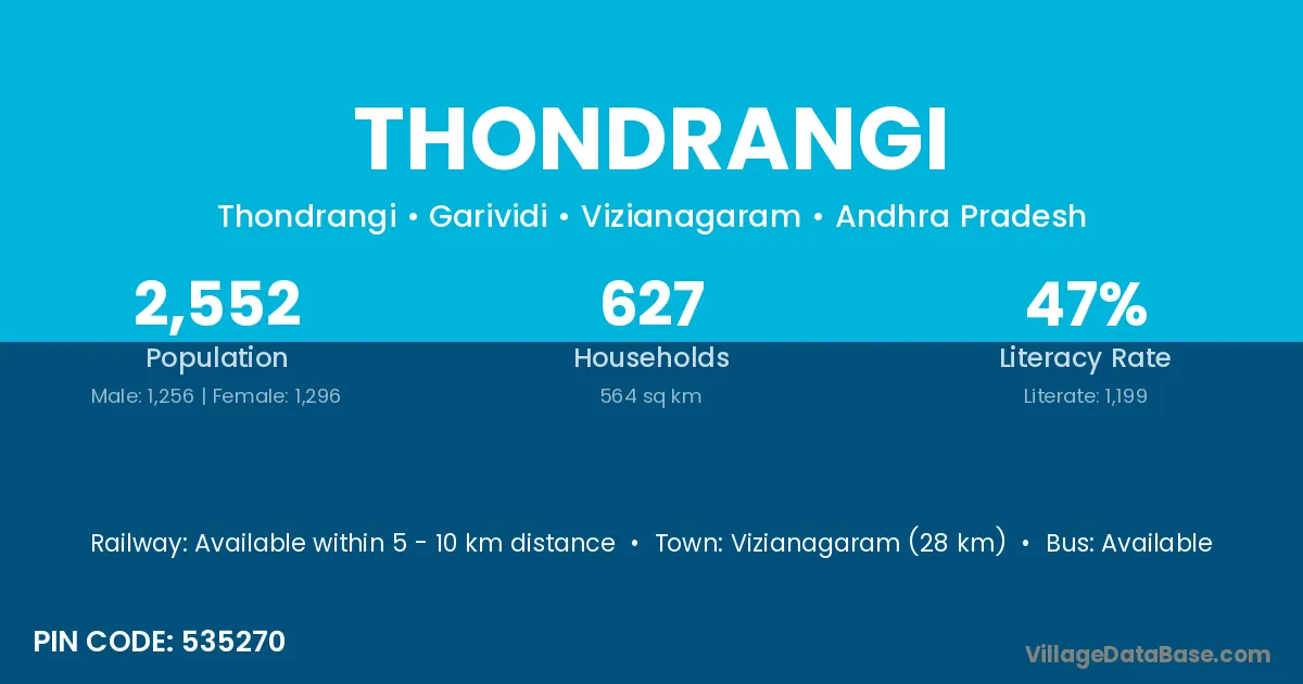 Vizianagaram (28 km) is the nearest town to Thondrangi village for major economic activities and is located approximately 28 km away.