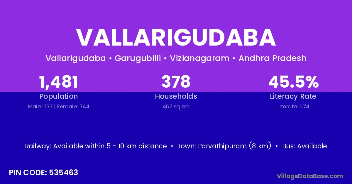Parvathipuram (8 km) is the nearest town to Vallarigudaba village for major economic activities and is located approximately 8 km away.