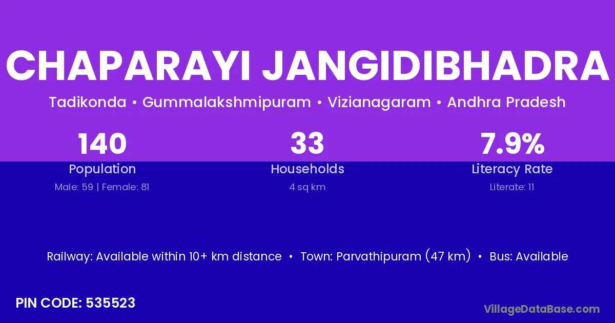 Parvathipuram (47 km) is the nearest town to Chaparayi Jangidibhadra village for major economic activities and is located approximately 47 km away.