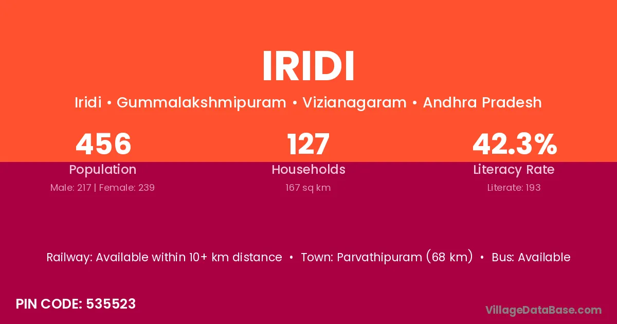 Parvathipuram (68 km) is the nearest town to Iridi village for major economic activities and is located approximately 68 km away.