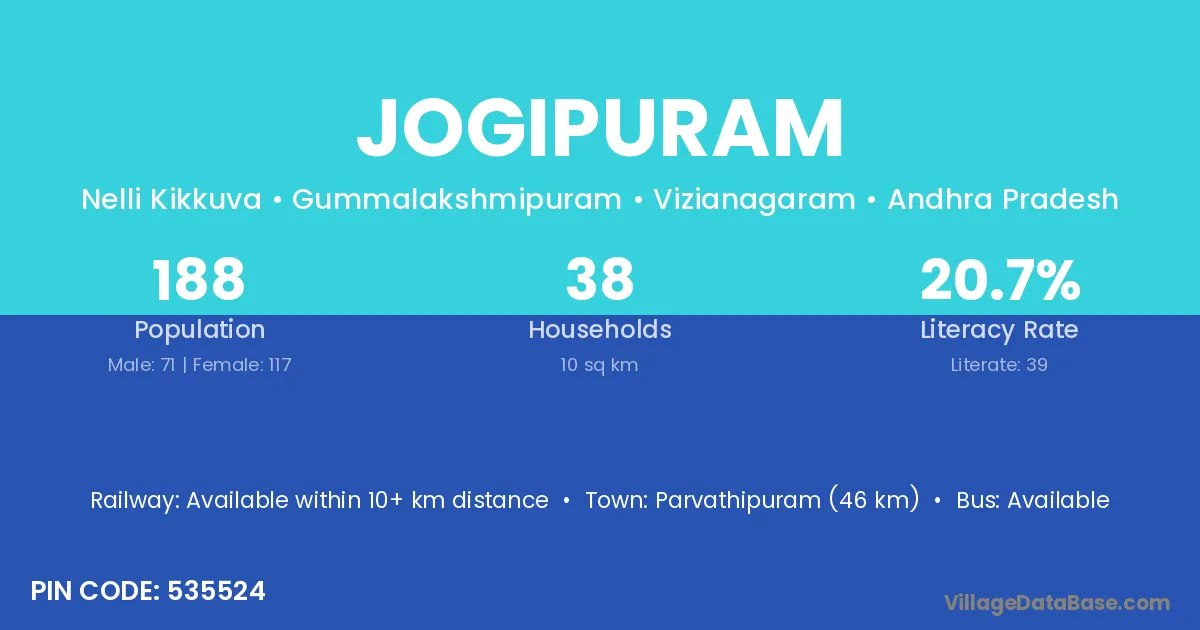 Jogipuram village has a total population of 188 people, of which 71 are males and 117 are females.