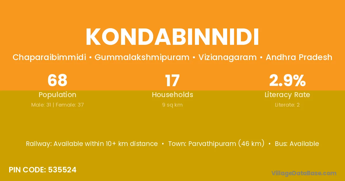 Kondabinnidi village has a total population of 68 people, of which 31 are males and 37 are females.