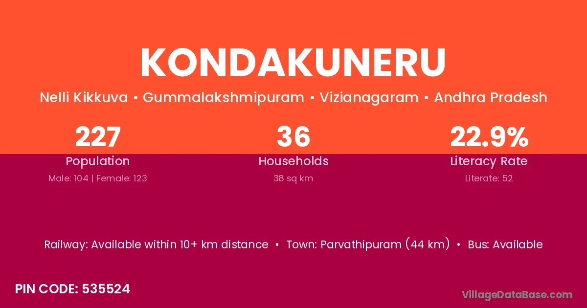 Kondakuneru village has a total population of 227 people, of which 104 are males and 123 are females.