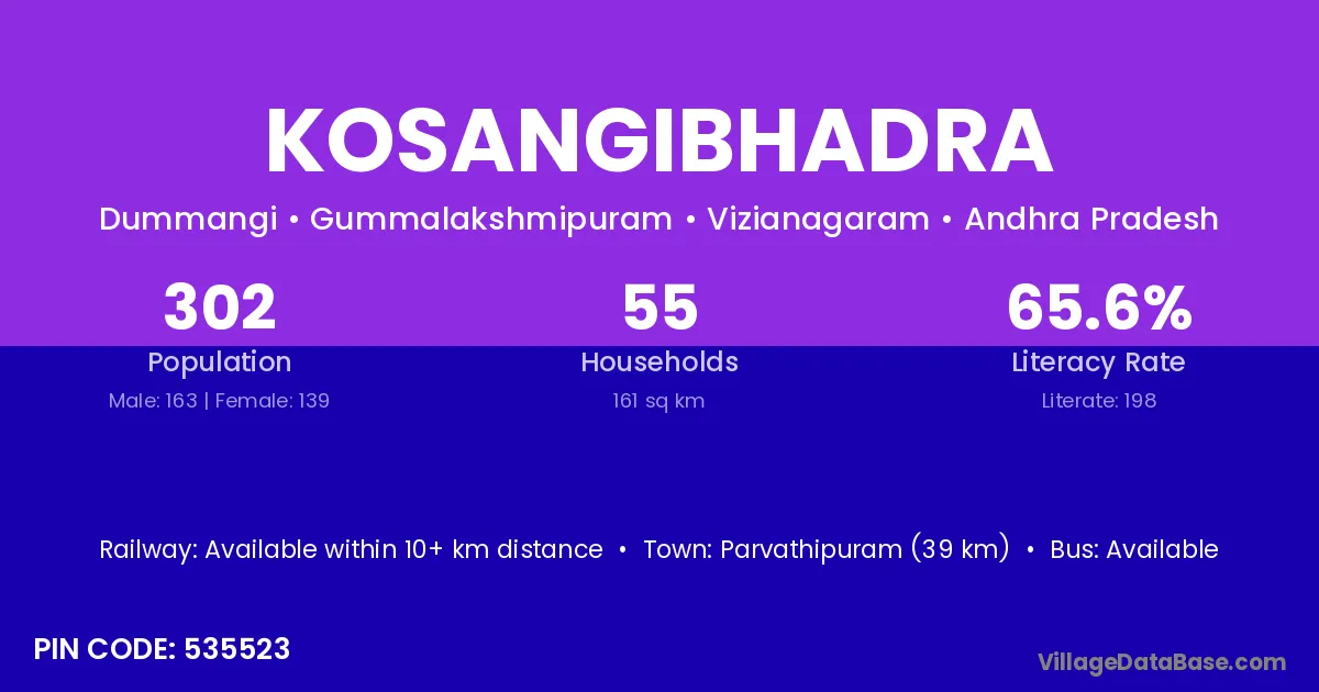 Parvathipuram (39 km) is the nearest town to Kosangibhadra village for major economic activities and is located approximately 39 km away.