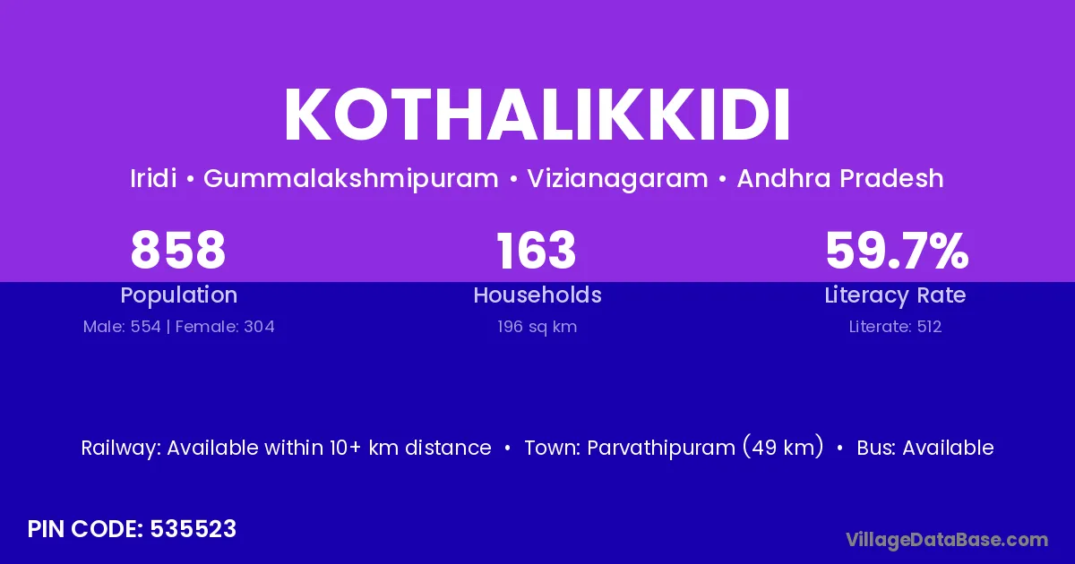 Parvathipuram (49 km) is the nearest town to Kothalikkidi village for major economic activities and is located approximately 49 km away.