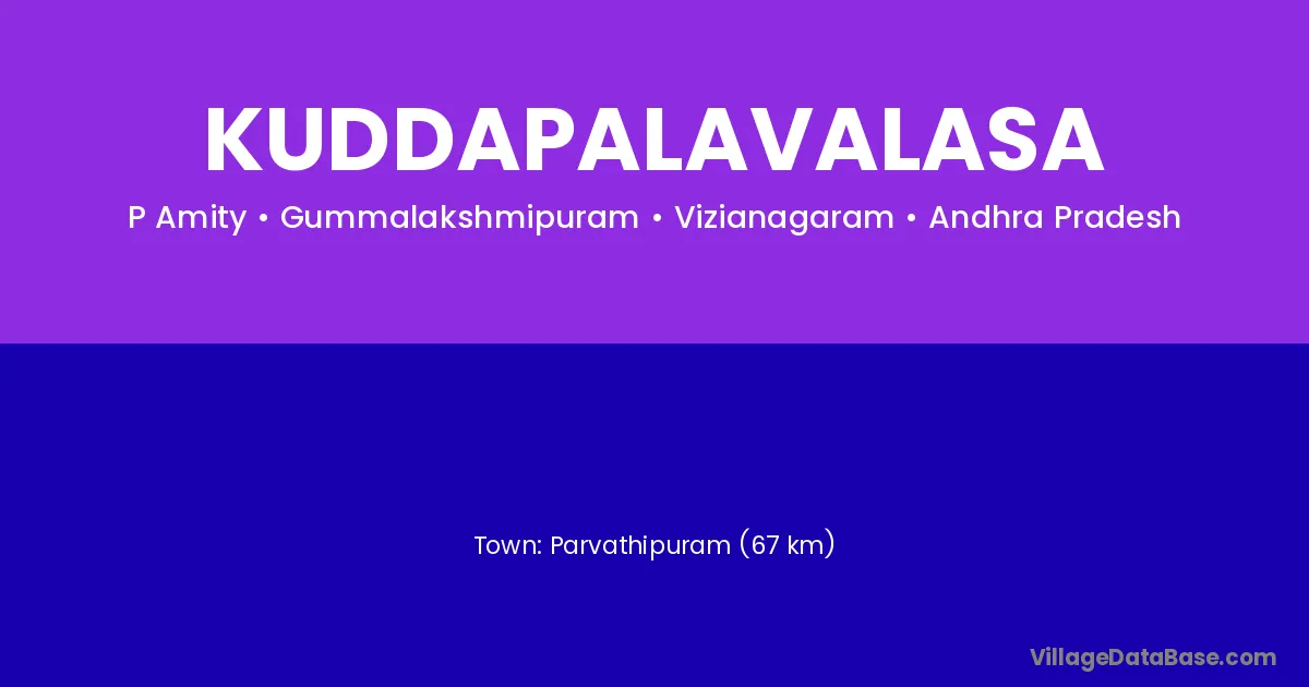 Parvathipuram (67 km) is the nearest town to Kuddapalavalasa village for major economic activities and is located approximately 67 km away.