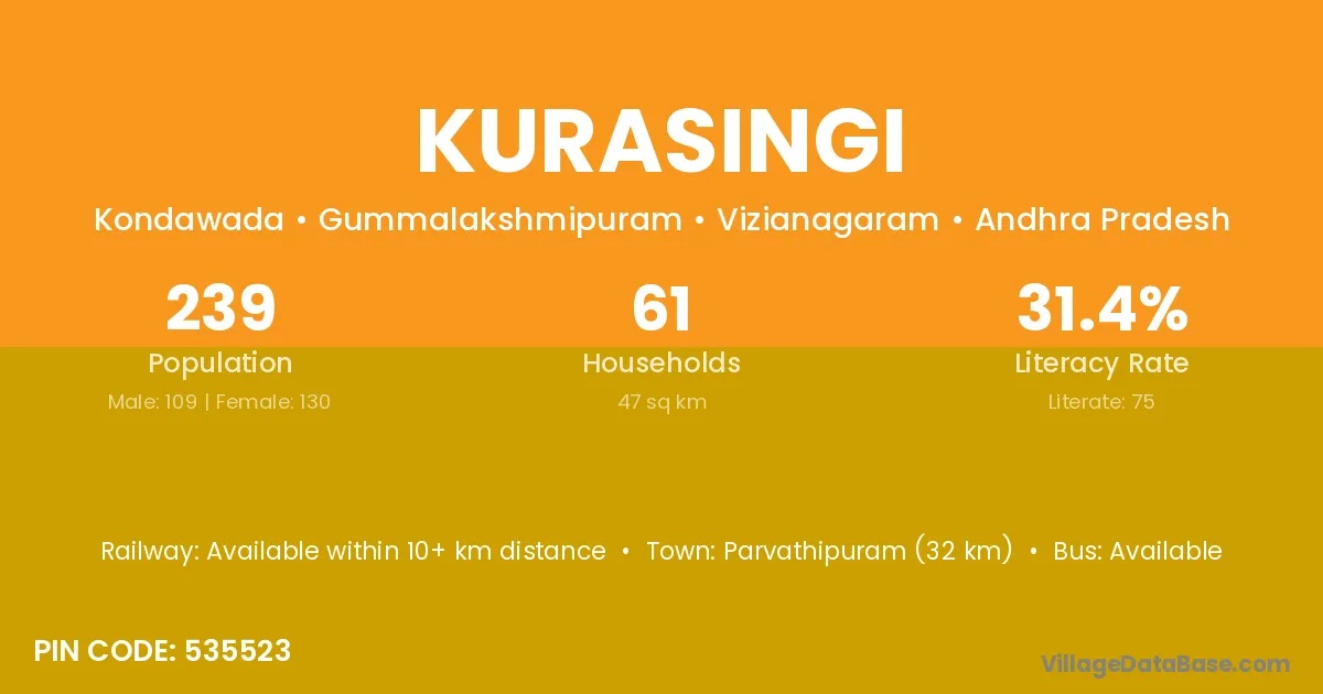 Parvathipuram (32 km) is the nearest town to Kurasingi village for major economic activities and is located approximately 32 km away.