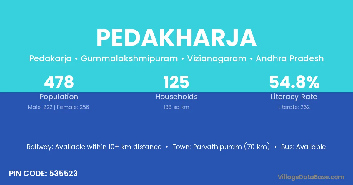 Parvathipuram (70 km) is the nearest town to Pedakharja village for major economic activities and is located approximately 70 km away.