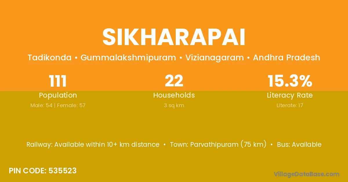 Parvathipuram (75 km) is the nearest town to Sikharapai village for major economic activities and is located approximately 75 km away.