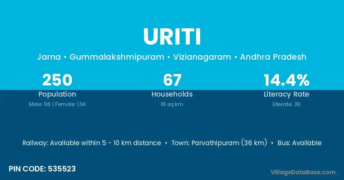 Parvathipuram (36 km) is the nearest town to Uriti village for major economic activities and is located approximately 36 km away.