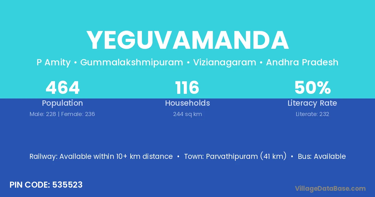Parvathipuram (41 km) is the nearest town to Yeguvamanda village for major economic activities and is located approximately 41 km away.