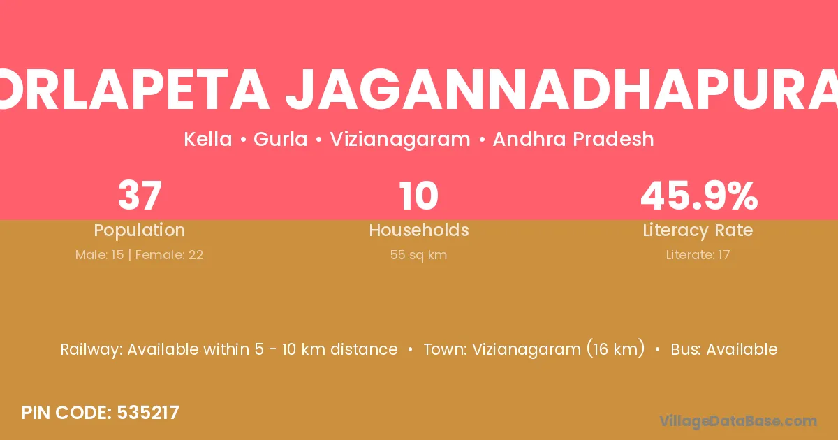 Vizianagaram (16 km) is the nearest town to Gorlapeta Jagannadhapuram village for major economic activities and is located approximately 16 km away.