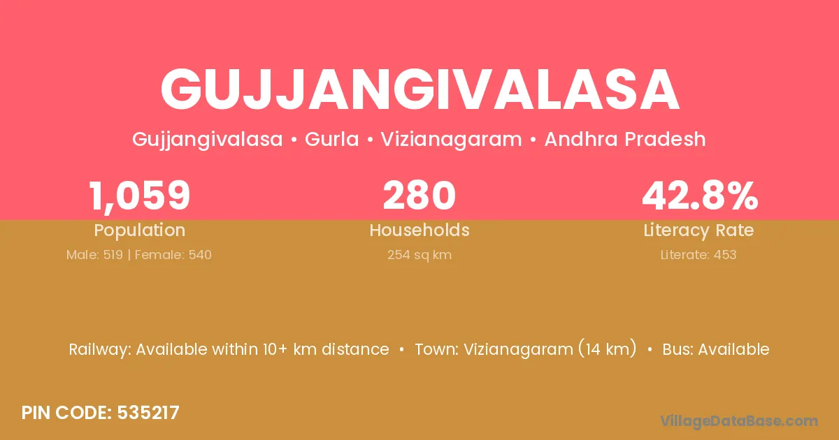Gujjangivalasa village has a total population of 1,059 people, of which 519 are males and 540 are females.