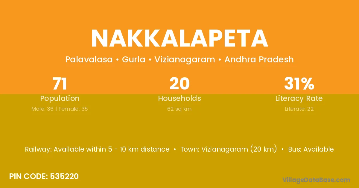 Nakkalapeta village has a total population of 71 people, of which 36 are males and 35 are females.