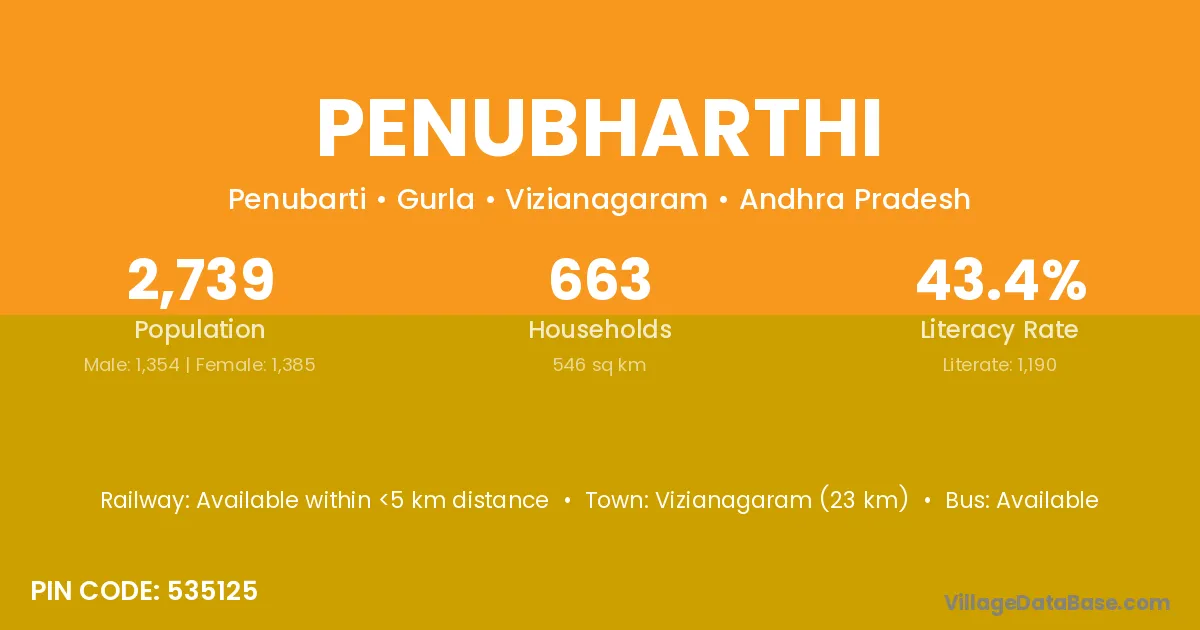 Vizianagaram (23 km) is the nearest town to Penubharthi village for major economic activities and is located approximately 23 km away.
