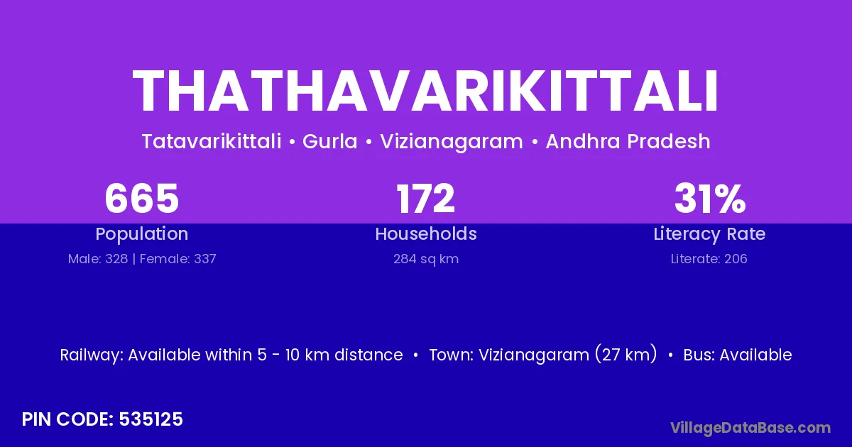 Thathavarikittali village has a total population of 665 people, of which 328 are males and 337 are females.