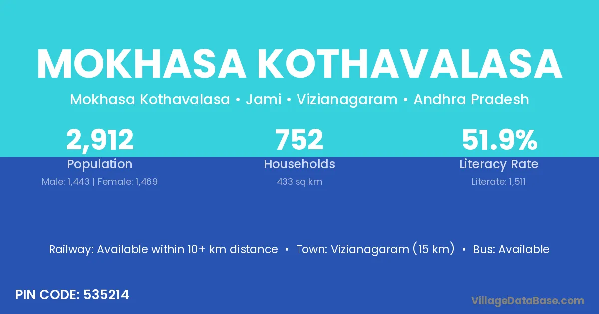 According to Census 2011 information, the village code of Mokhasa Kothavalasa village is 535214.