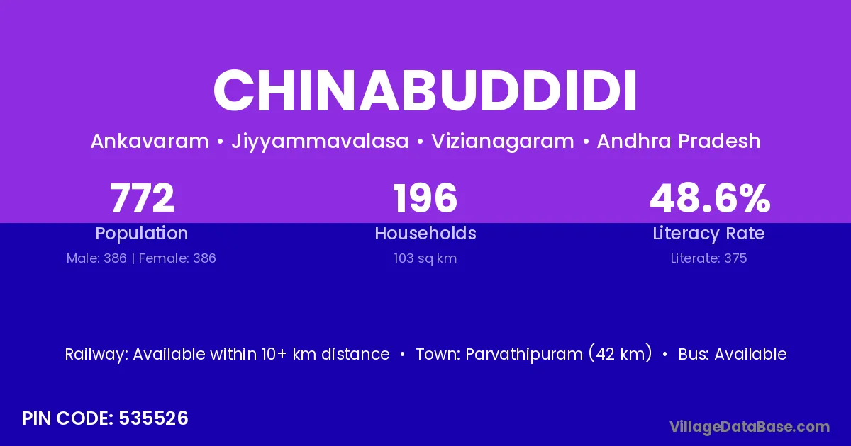 Chinabuddidi village has a total population of 772 people, of which 386 are males and 386 are females.