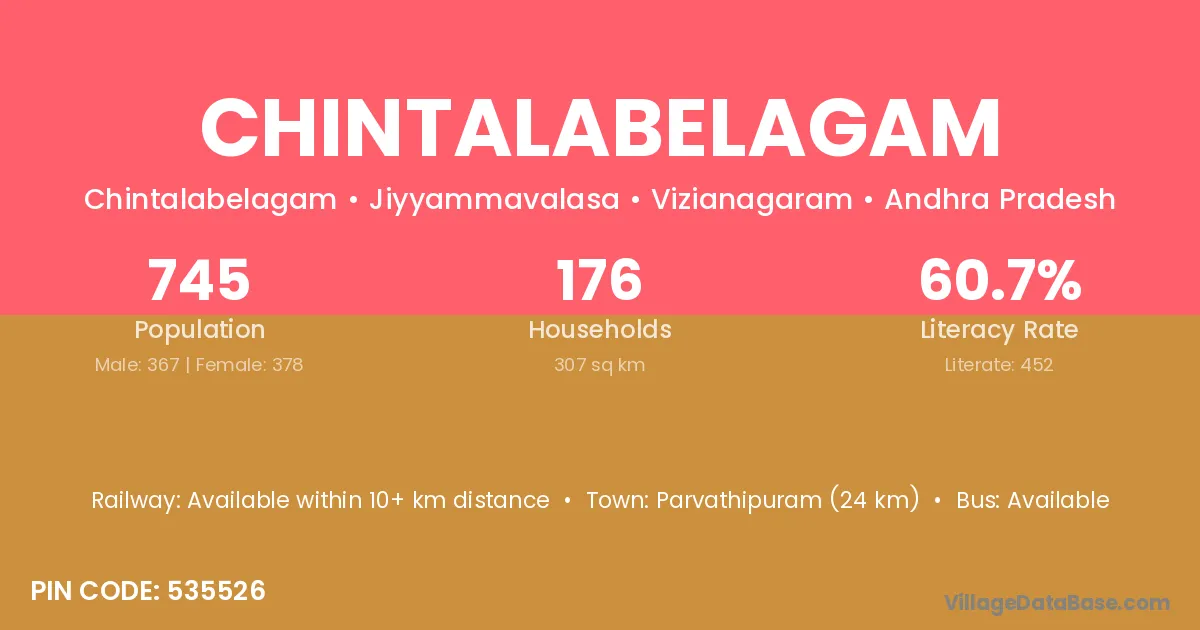 Parvathipuram (24 km) is the nearest town to Chintalabelagam village for major economic activities and is located approximately 24 km away.