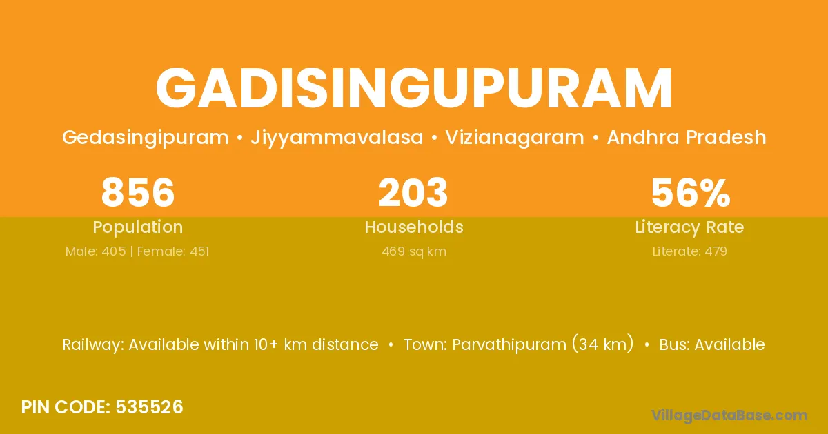 Parvathipuram (34 km) is the nearest town to Gadisingupuram village for major economic activities and is located approximately 34 km away.